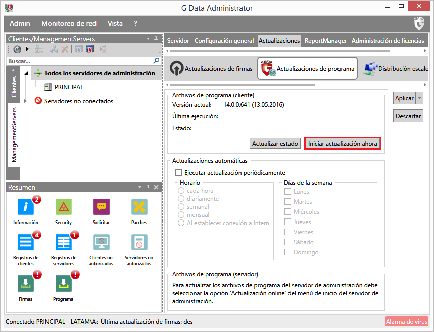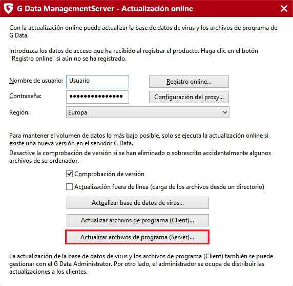 Las actualizaciones de programa de G DATA Management Server tienen que realizarse manualmente y no automáticamente.