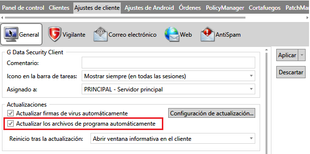 Tras la actualización de G DATA Management Server, se actualizarán automáticamente los clientes en la siguiente conexión con Management Server.