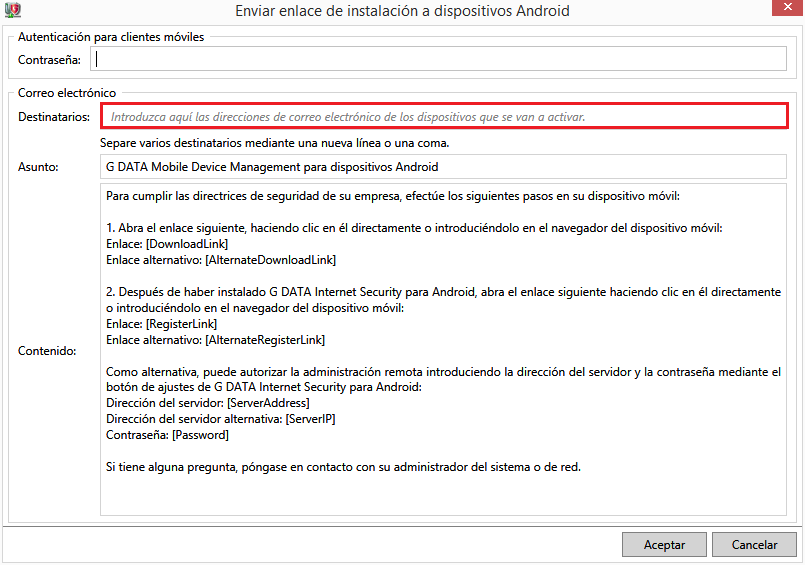 (El link de instalación se enviará a través de correo electrónico, lo que requiere que esté correctamente configurado el correo electrónico en G DATA ManagementServer)