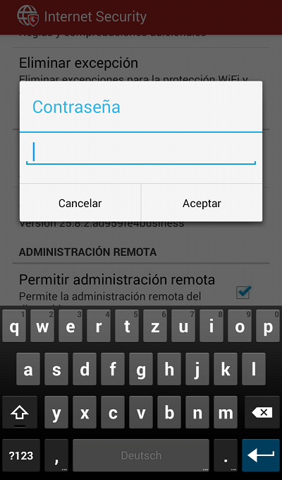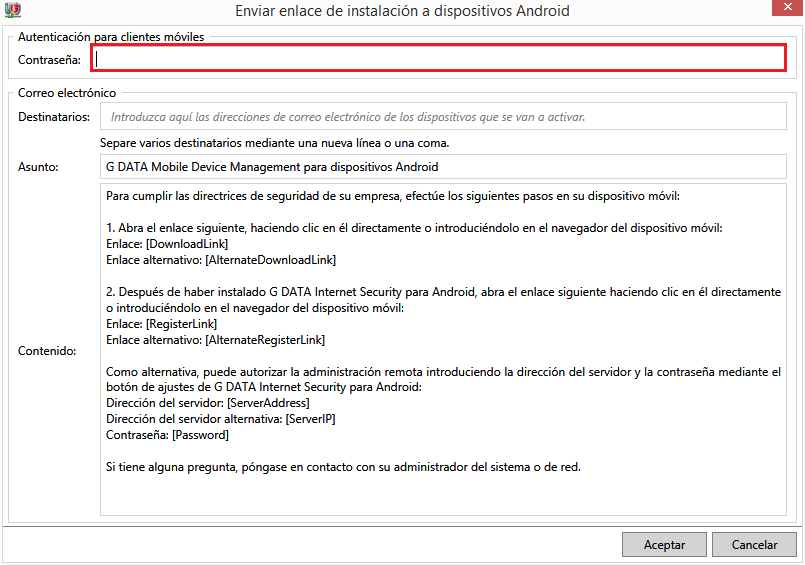 Paso 10. A continuación introduzca la contraseña que fue introducida en G DATA Administrator en ManagementServers > Configuración general > Android