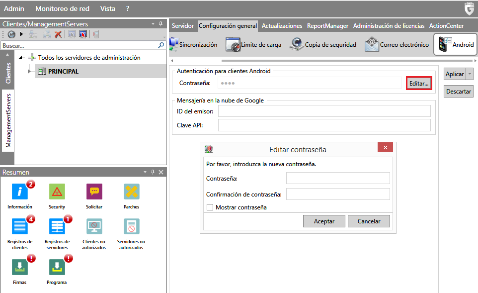 ManagementServers > Configuración general > Android > Contraseña > Editar.