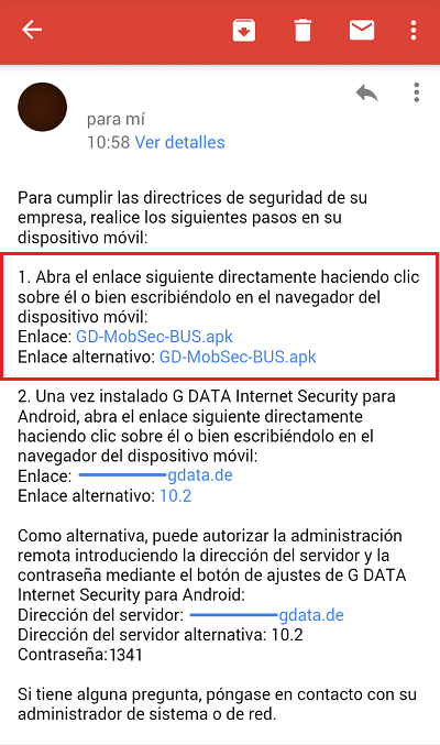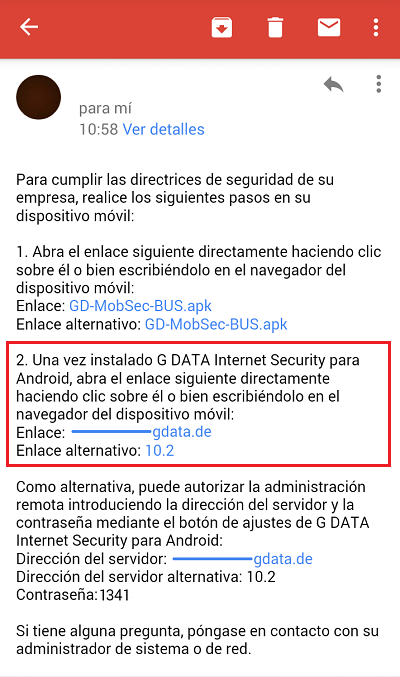 Paso 8. Para comenzar la instalación de la app de G DATA, haga clic en uno de los enlaces de instalación (G DATA-MobSec.apk) que se muestran al principio del correo electrónico.
