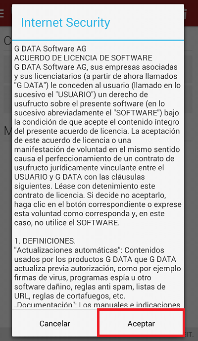 Paso 3. Inicie la App de G DATA Mobile Client para Android y acepte el acuerdo de licencia del software.