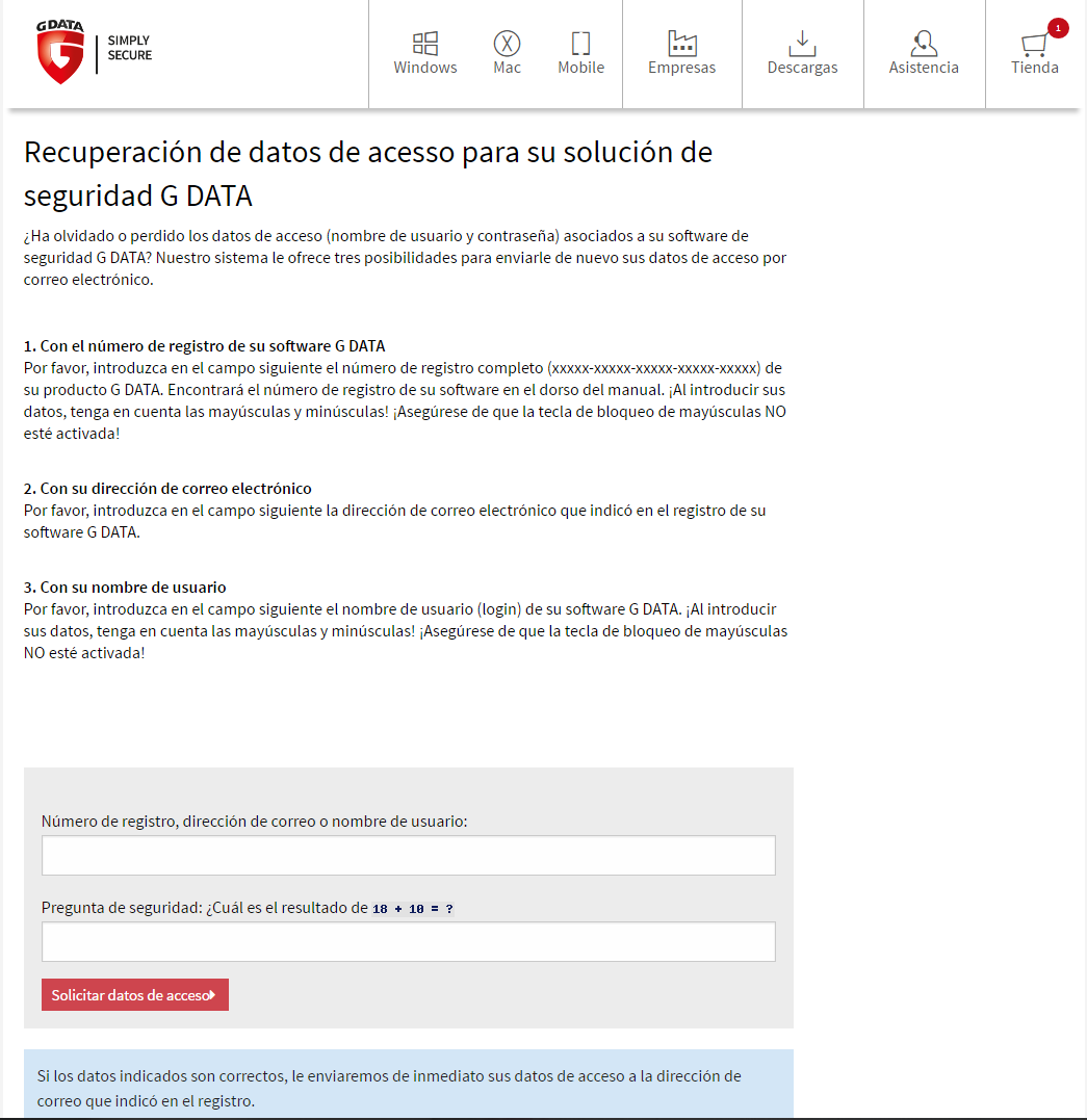 Este artículo le ayudará a solicitar de nuevo sus datos de acceso de G DATA (nombre de usuario y contraseña).