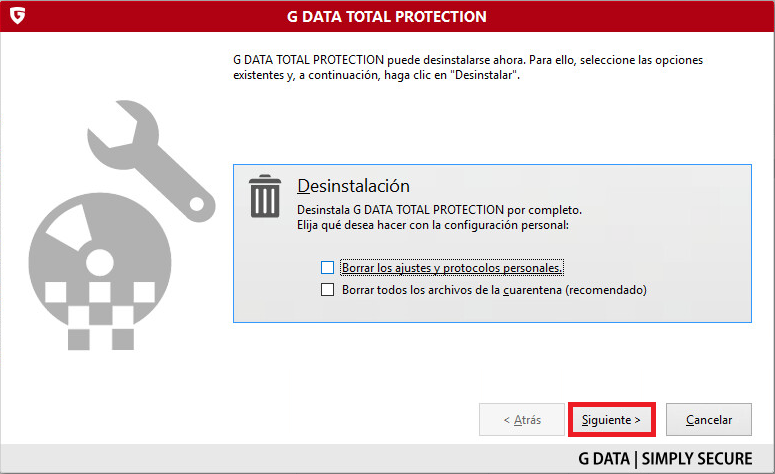 Si el proceso de desinstalación estándar no es posible, se puede eliminar el producto de G DATA en cualquier momento desde el archivo de instalación.