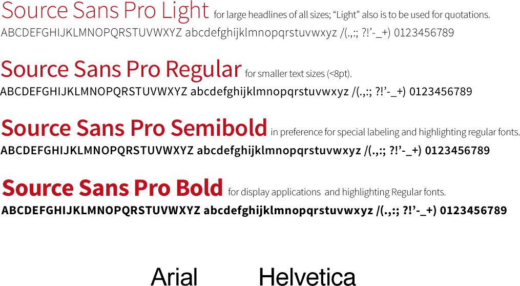 Source Sans Pro" from other sources can serve as a fallback solution. For example, for a quick presentation when the font is not installed on a system. Other fallback solutions can be "Arial" or any other modern grotesque typeface (Helvetica, etc.).